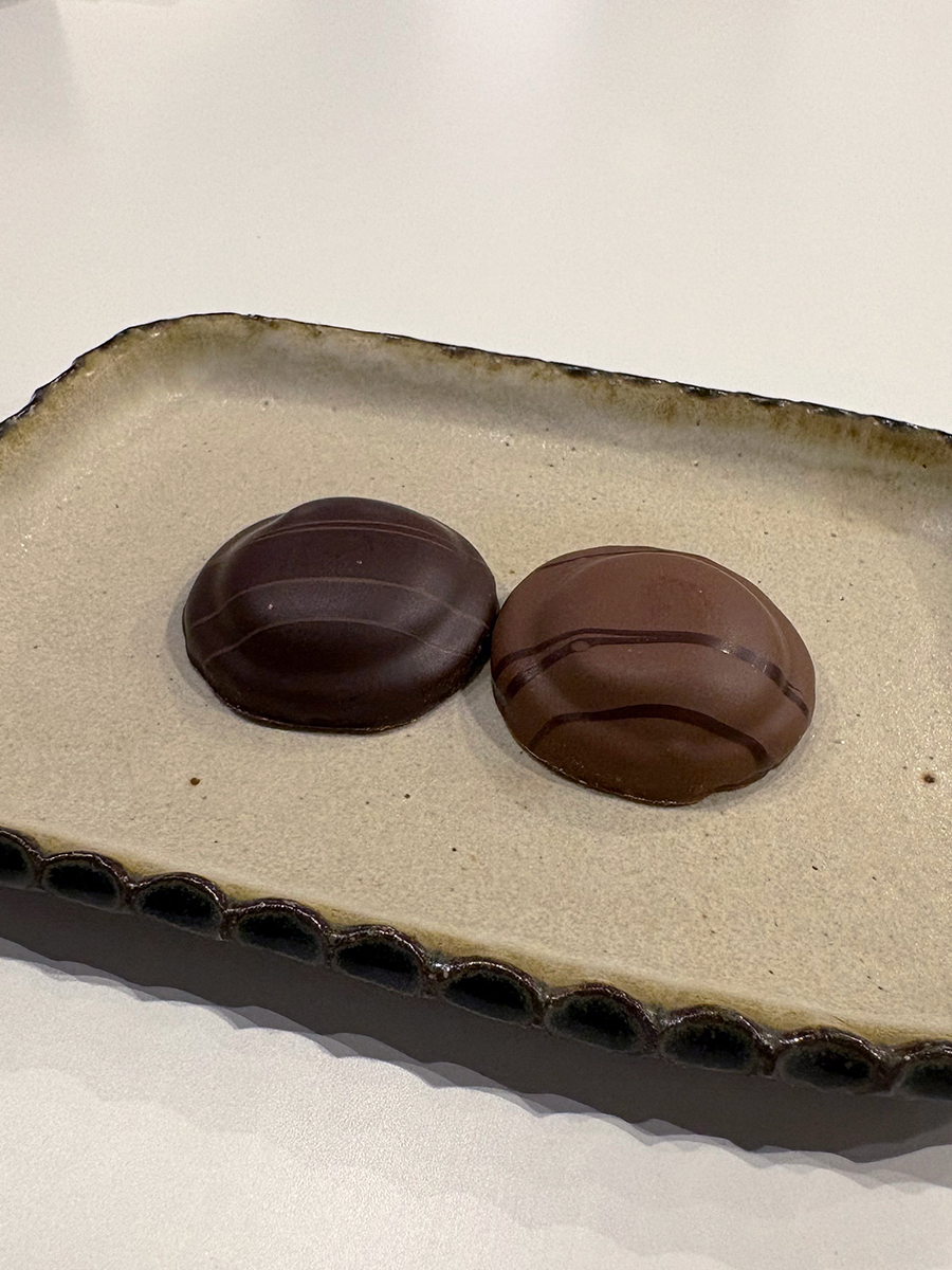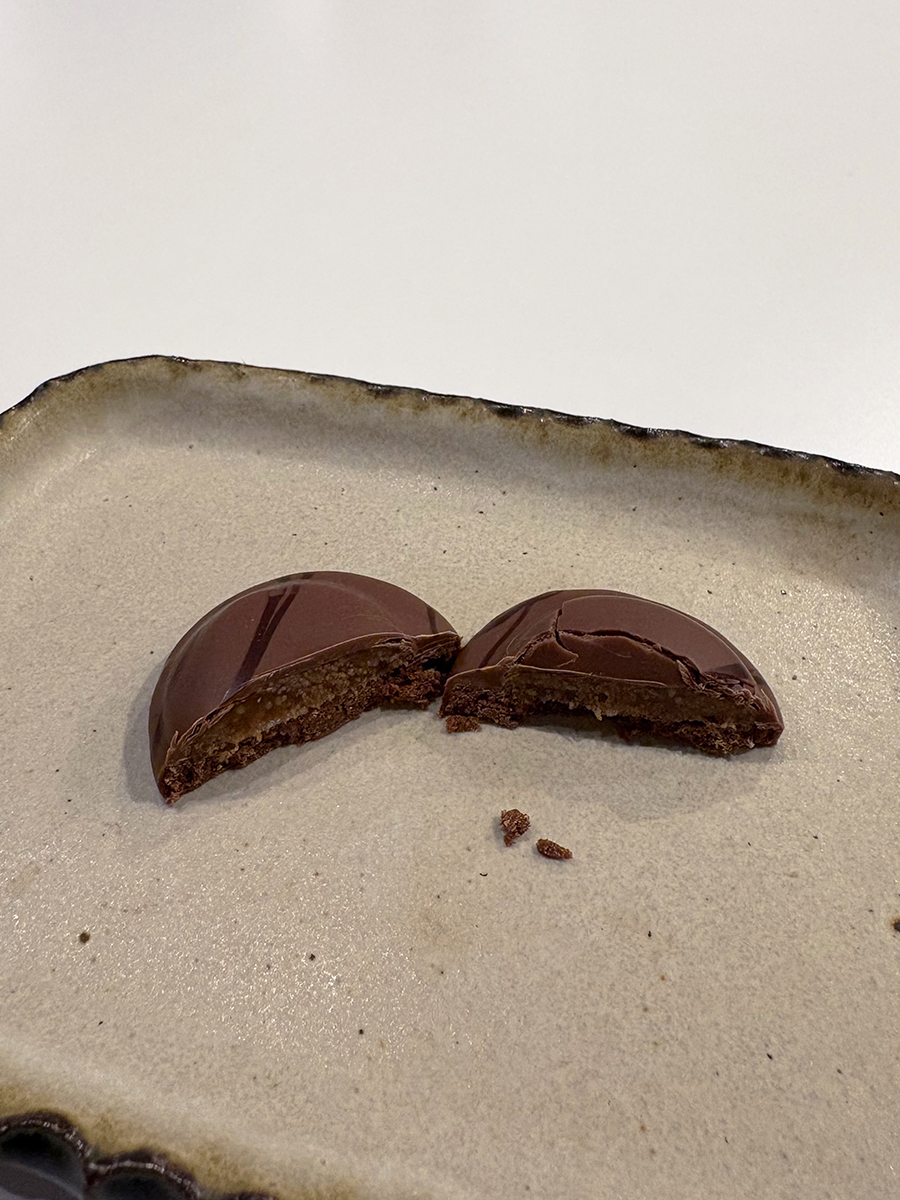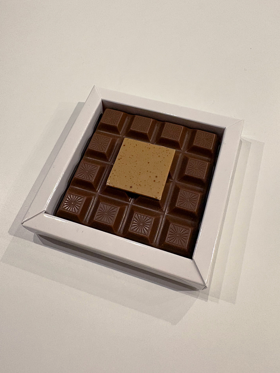 チョコレートサブレの上にコーヒー風味のキャラメルを乗せ、ダーク・ミルクチョコレートでそれぞれコーティング。