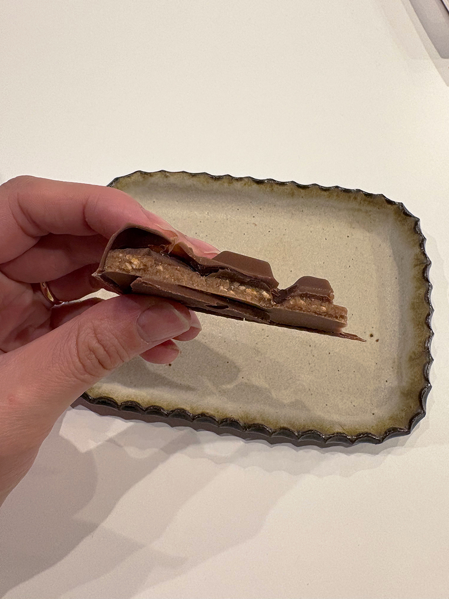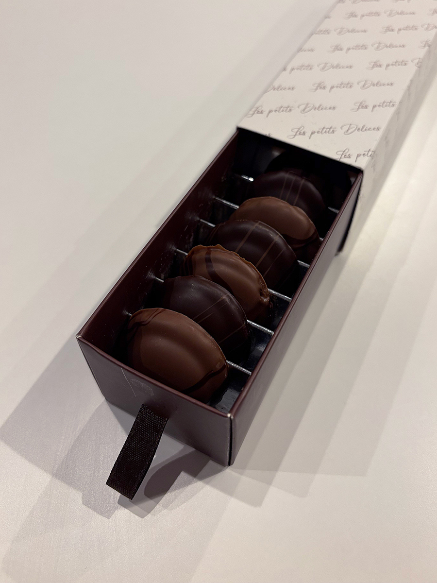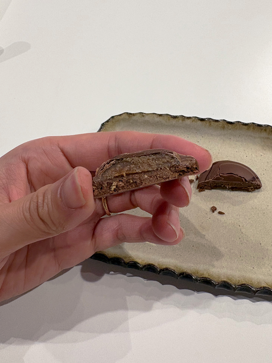チョコレートサブレの上にコーヒー風味のキャラメルを乗せ、ダーク・ミルクチョコレートでそれぞれコーティング。