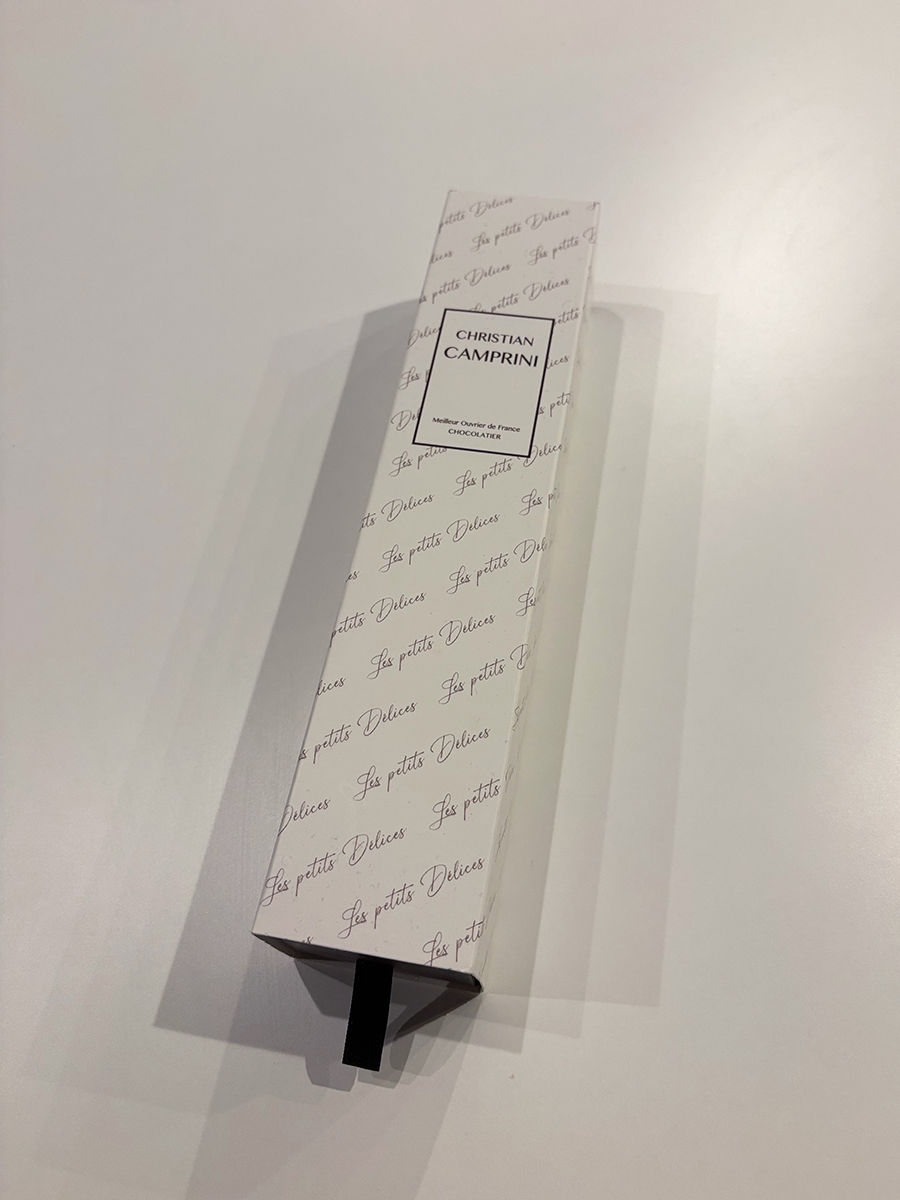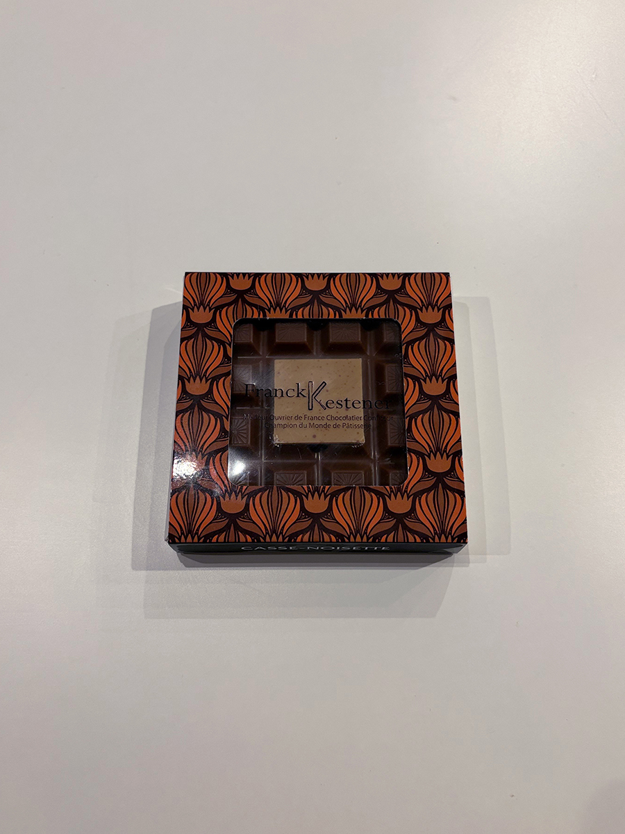 クリームにヘーゼルナッツのサブレとレモンが練り込まれ、周りをミルクチョコレートでコーティングしています。