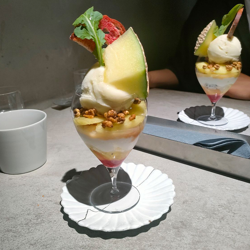 メロンとフランボワーズ、すだち、ドラゴンフルーツ。初夏を感じる爽やかなパフェでした。
