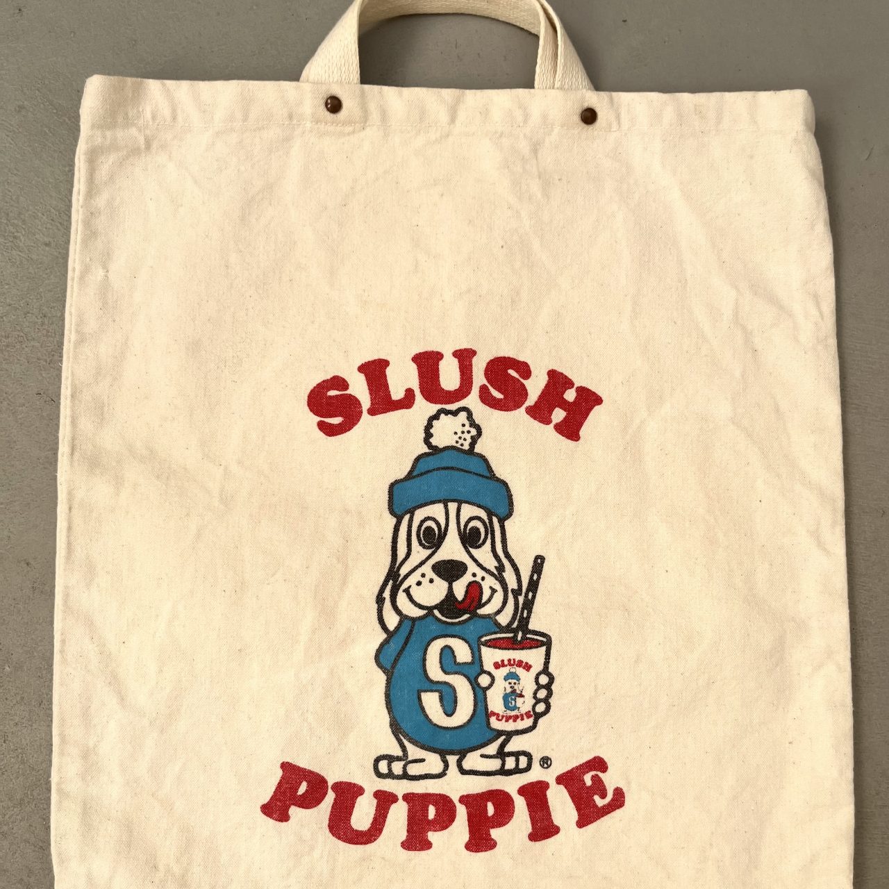 『SLUSH PUPPIE』のキャラクターがプリントされた少し古そうなトートバックです。