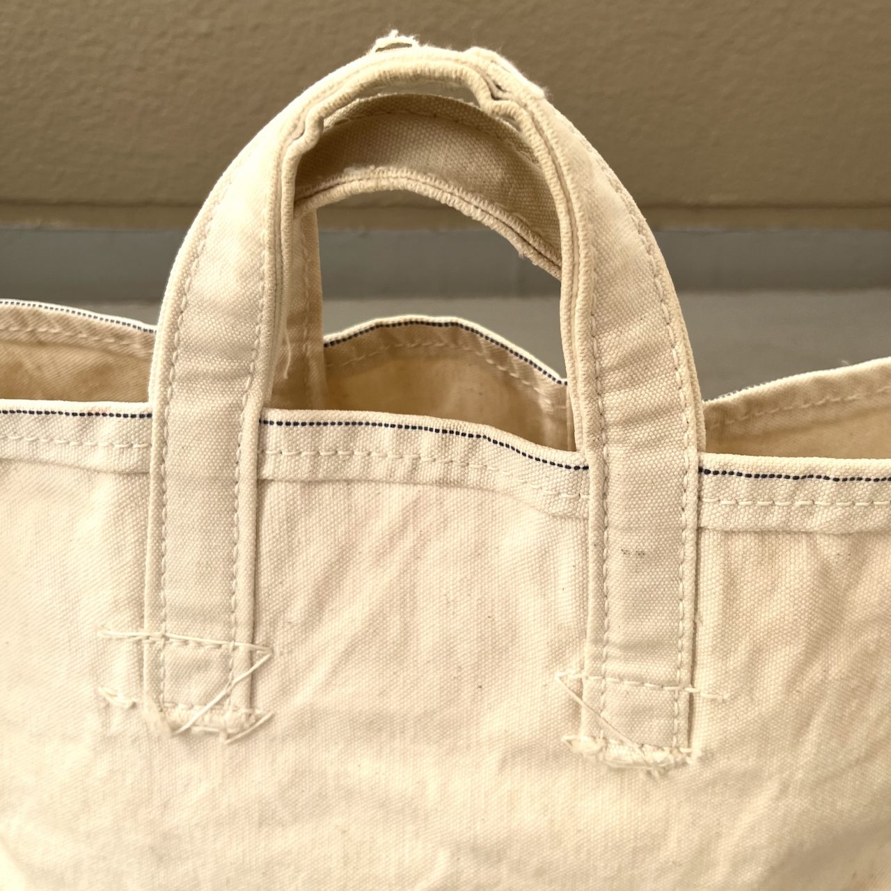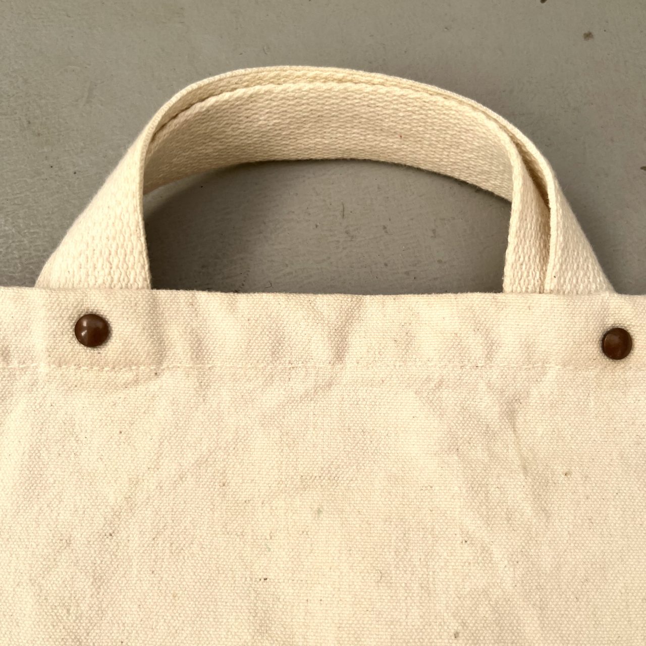かわいいプリントに反して、持ち手のハンドルは短く、打ち込みのリベットを使ったオールドな仕様も気に入ってます。