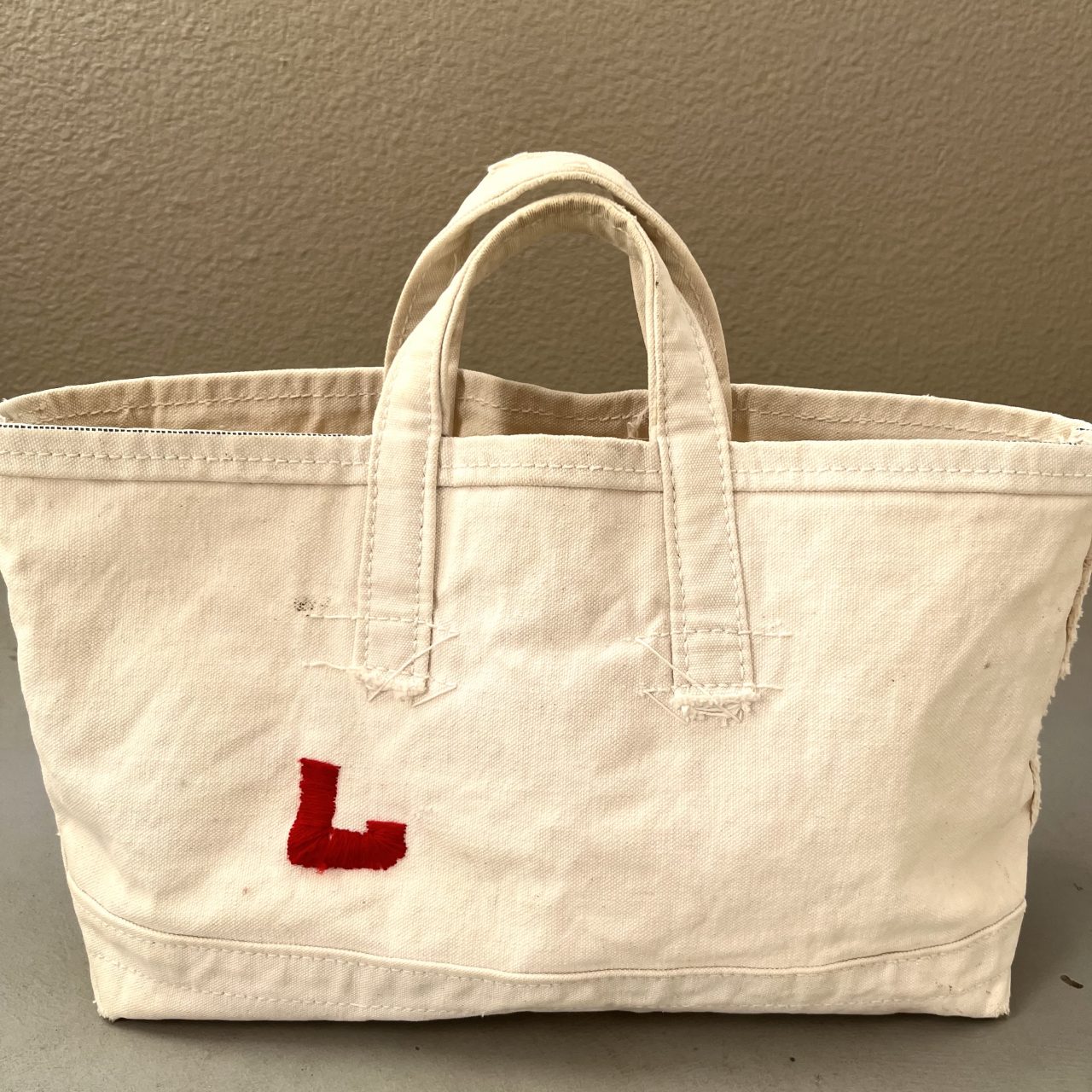 小ぶりでユニークなサイズ感と、Lの赤い刺繍のバランスがとても良い雰囲気なんです。