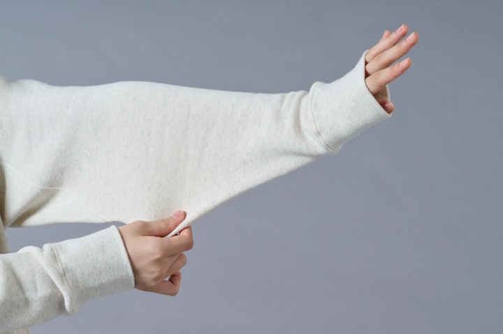 生地は、職人さん達が長年培ってきた技術で、空気をふくませ丁寧に一枚一枚編み上げることで、ほかでは味わえない柔らかく包み込まれるような軽さのスウェットに。