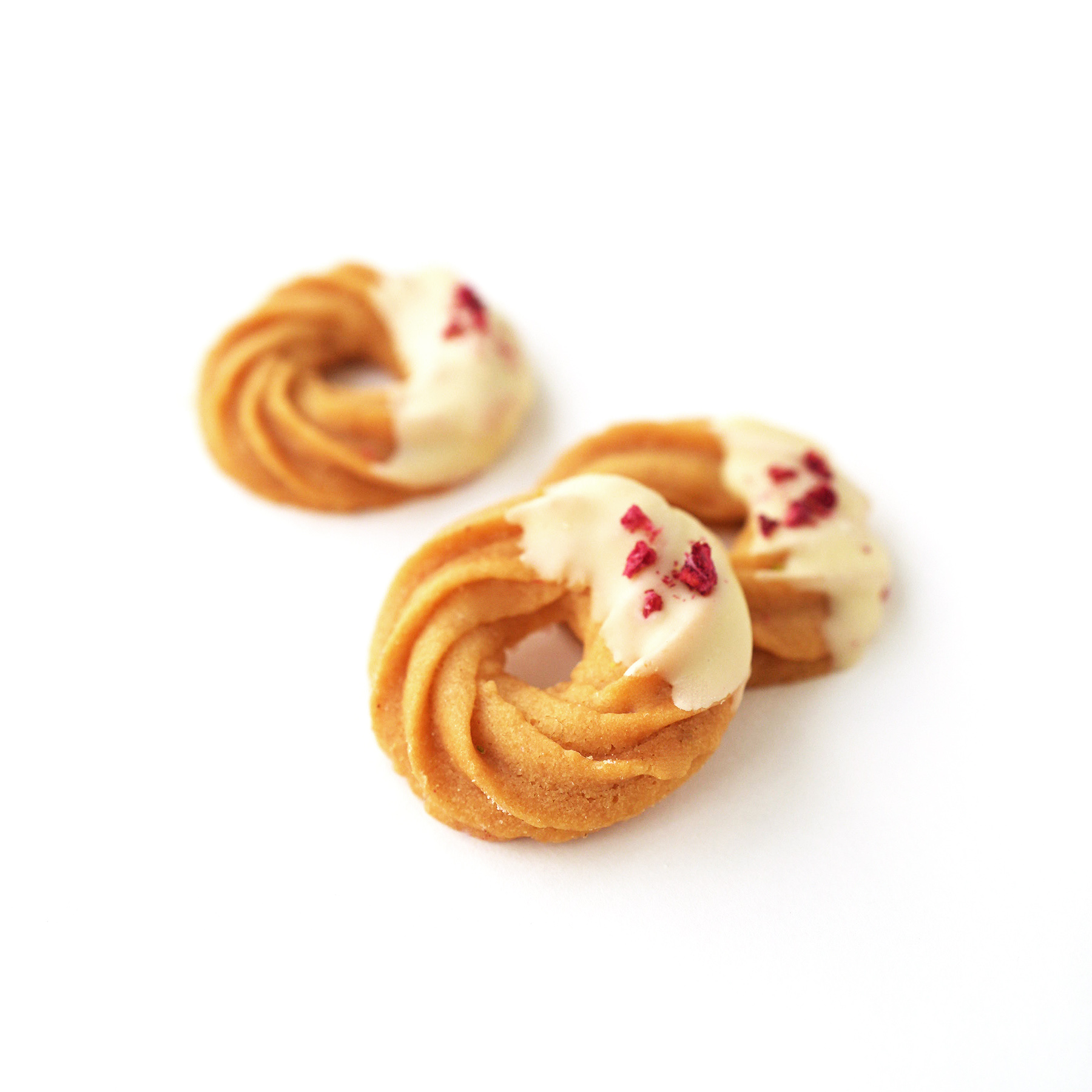 卵白を使ったサクサク食感の絞り出しサブレは円形に絞ってリースに見立てました。チョコレートはやはりこだわって仏ヴァローナ社のミルキーなホワイトチョコレートで。近年価格高騰しているチョコレートですが、やはりここは譲れないポイントです。口溶けにもこだわって選びました。ちょっと甘酸っぱいフリーズドライのフランボワーズがいいアクセントになっています。