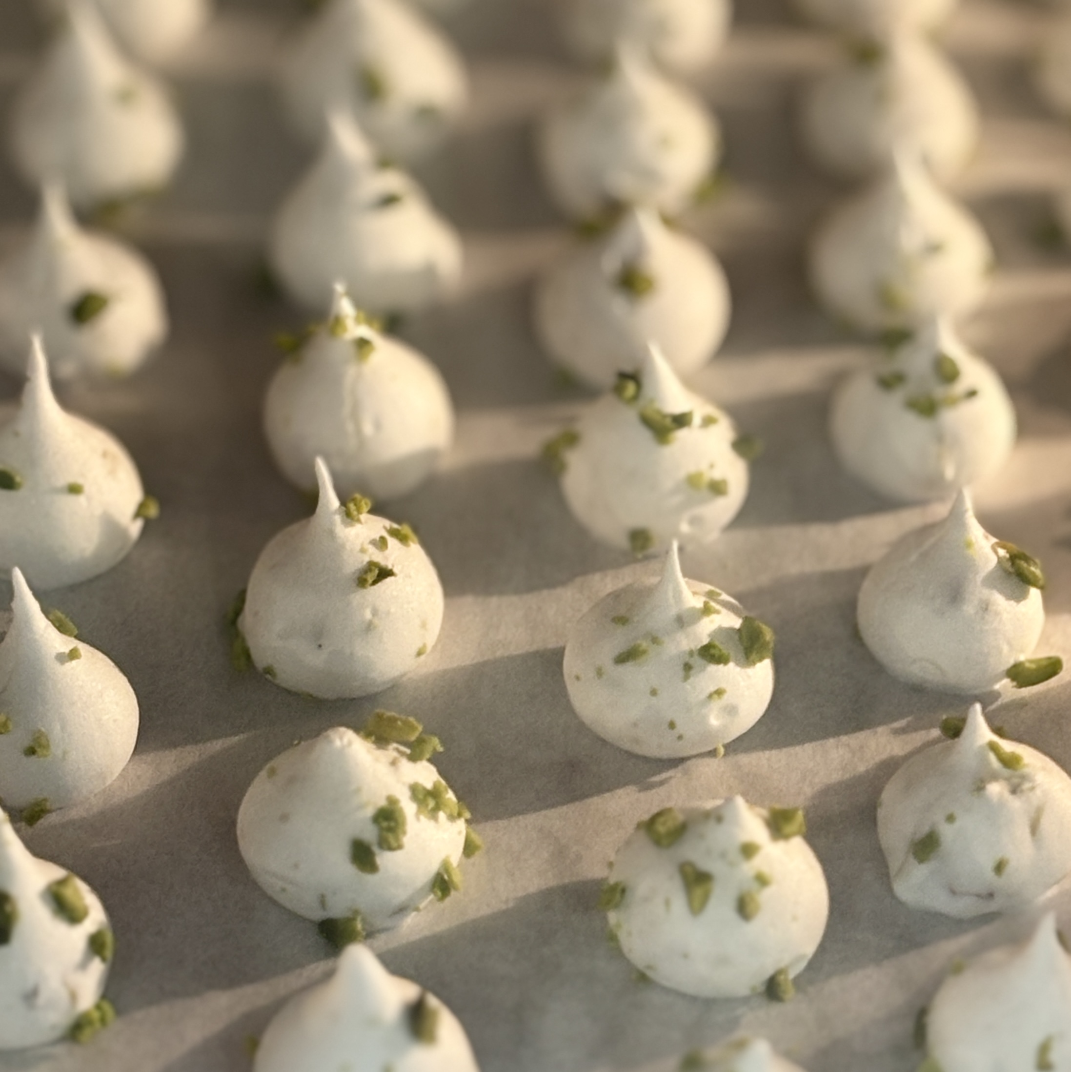 今回のメレンゲクッキーには中にも外にも細かく刻んだピスタチオを加えて、甘いだけではない塩気とナッツの旨味が感じられるものになっています。オーブンの中でじっくりと低温で時間をかけて焼くことでサクサクに仕上がります。