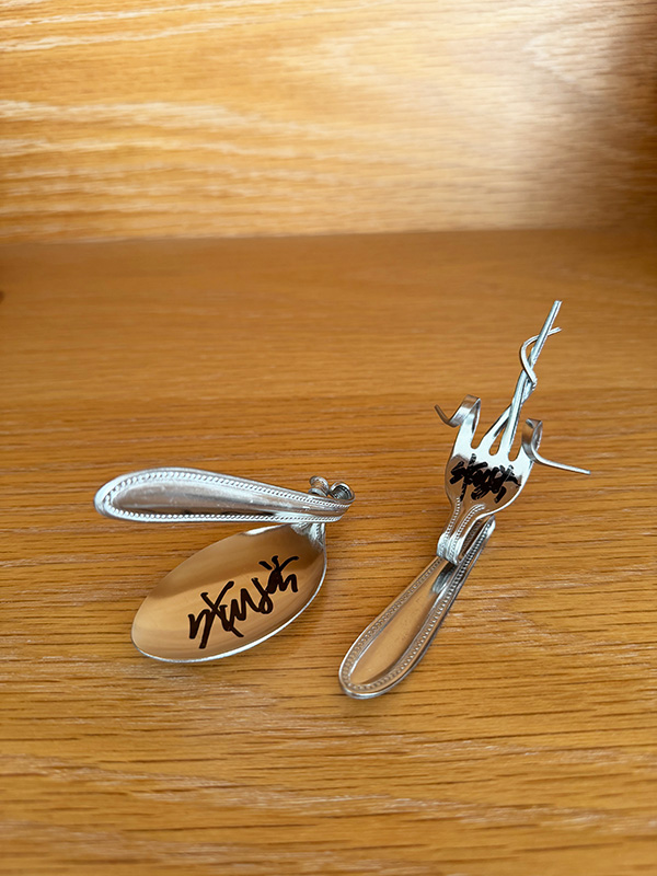 マスターが曲げたスプーンとフォーク。