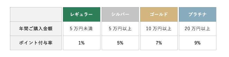 *ステージダウンに関しては、年に一度、8月1日時点での過去1年間の購入金額に応じて査定が行われます。