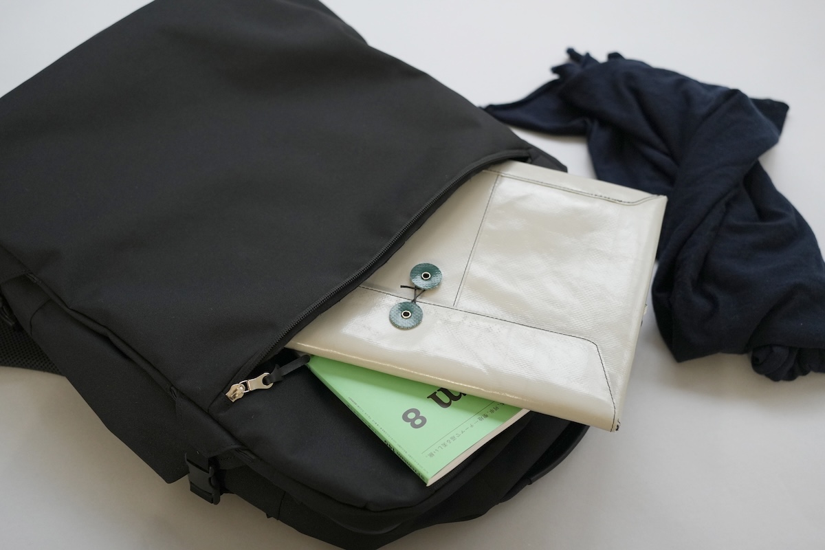 新幹線の中や飛行機の機内で使うかもしれないモノを入れておくのがおすすめです。外でメインスペースを開けるのはかなり億劫なので、このポケットが大活躍します。