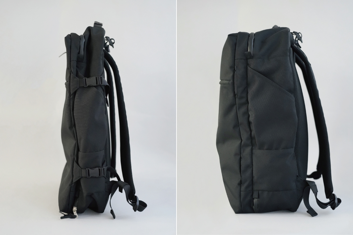 両サイドには上下に2箇所ずつ調整バックルを付けていて、荷物の量に応じてマチ幅を調整できるようになっています。