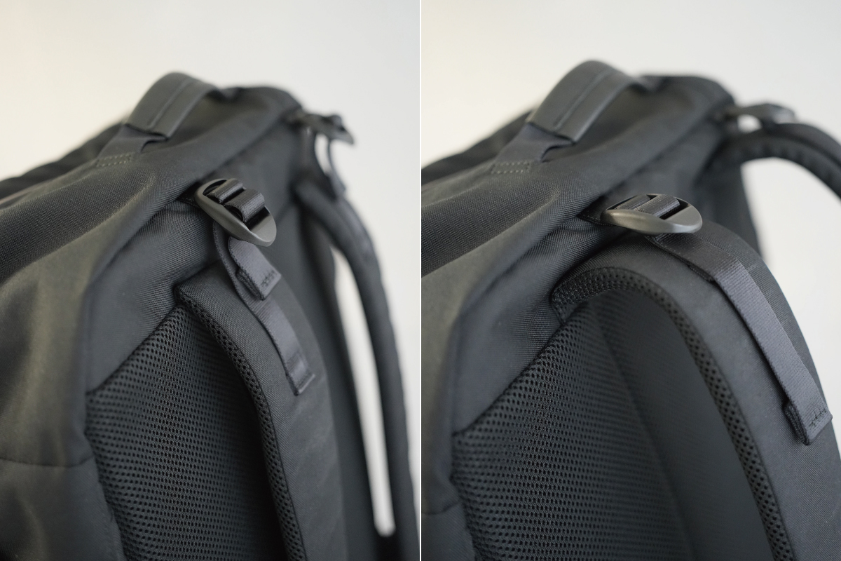 また、ハーネス上部にもバックルを付けて立ち上がりを調整できるようにすることで、重い荷物が入っている時もフィット感を損なわないようになっています。